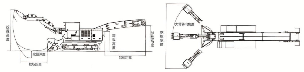 本機靠推進鏟取巖石并通過鏟斗將石料扒進自身的刮板輸送機,輸送機從尾部將巖石卸入側(cè)卸式礦車、箕斗、皮帶機、梭式礦車、自卸汽車等其它轉(zhuǎn)載設(shè)備上去。同時可利用反鏟挖掘臂扒取遠處的巖石,也可以用鏟斗來清理工作面和斷面排險、掏水溝。